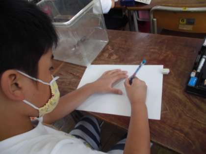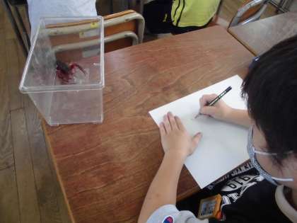 2年生は教室で飼育しているザリガニの観察です。ケースの上からだけでなく、手にもって、背中や腹側もしっかり見て絵を描きました。