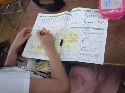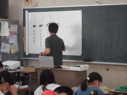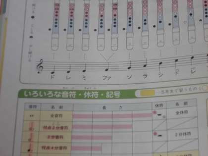 5年生はリコーダーと音符の学習です。リコーダーを吹くことができないので、絵を見て指使いを学びます。
