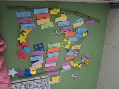 月日の経つのは早く、今日は七夕です。校内には七夕飾りがいくつかあります。子どもたちの楽しい願いや夢が伝わってきます。上から1年生、4年生、ひまわり学級です。