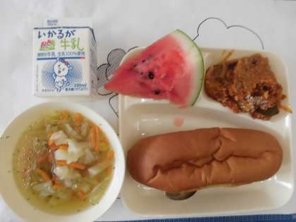 今日の給食は「かぼちゃのミートグラタン」「スープ」とデザートに「すいか」が出ました。夏にふさわしいデザートです。