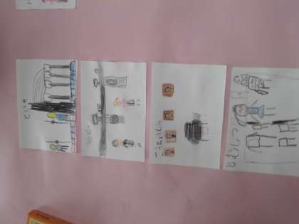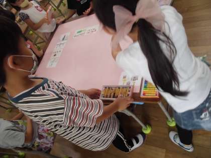 1年生は、学校たんけんで巡った各教室や部屋を絵にかいて、模造紙に貼りました。職員室の隣が校長室というように場所を正確に思い出して地図にしていました。
