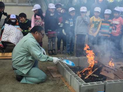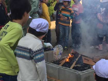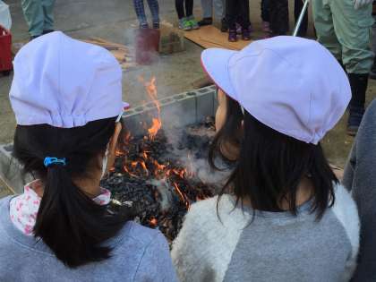 さつまいもをアルミホイールに包んでたき火の中に入れました。焼きいも、おいしくできあがれ!