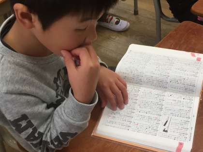 国語辞書を開くのもはじめてという子もいます。1年生なら当たり前です。従来は、3年生からの学習でした。でも、意味調べのためではなく、子どもたちは辞書を読み物のように読みます。それが辞書引き学習です。