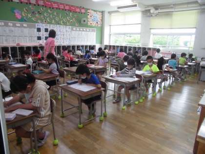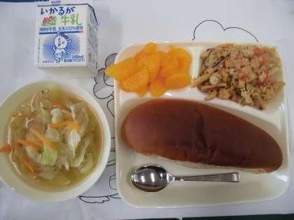 1年生は国語のテストに真剣に取り組みました。今日の給食は「パエリア」「ウインナーとキャベツのスープ」と黒糖パン、デザートは缶詰のみかんです。1年生は牛乳を全員、残すことなく飲むことができました。飲み残し入れのバケツは空っぽです。えらい!