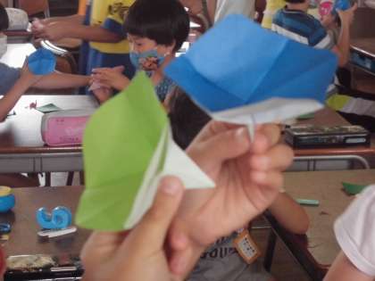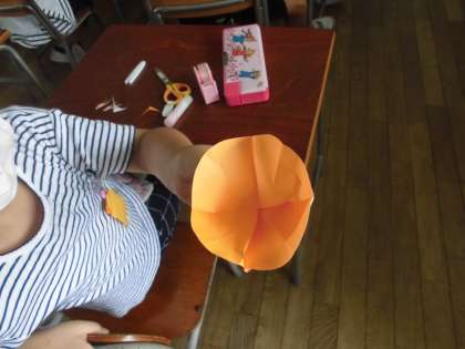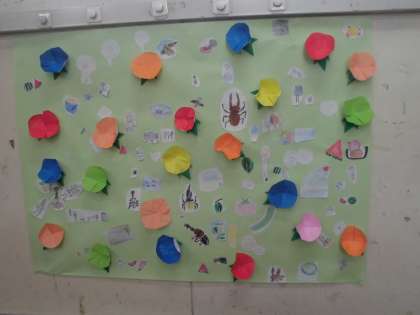 2年生は図工で折り紙を使ってアサガオを作りました。できたアサガオは模造紙に貼って周りを虫などの絵を描いて夏らしい作品に仕上げ、教室に飾りました。