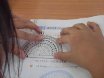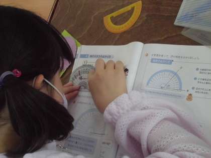 4年生は分度器を使って角度を測る学習です。少しでもずれると正確に測れないので、慎重に角度に分度器を当てていました。