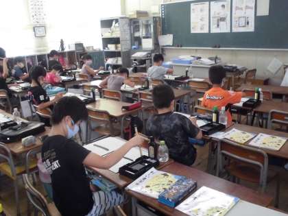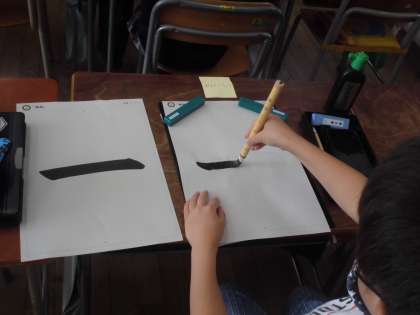 3年生は習字道具の使い方を習っていましたが、今日は初めて習字で字を書きました。字は漢字の「一」です。「筆をしっかり立てて書くように」等、基本に気を付けながら慎重に書いていました。