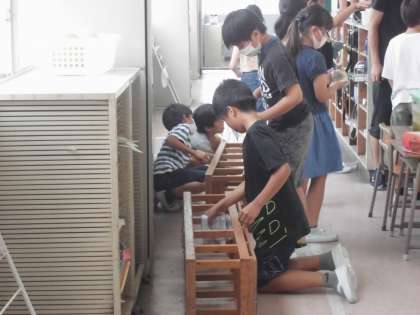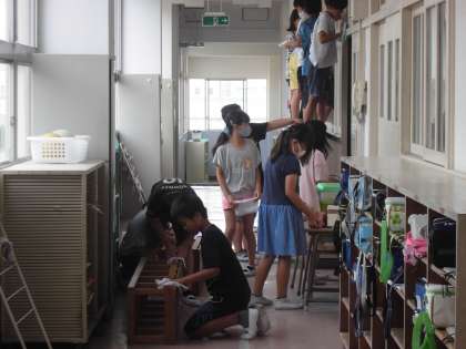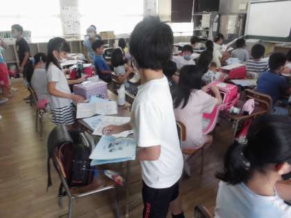 4年生は1学期の作品を子どもたちが配っていました。夏休みの宿題ももらい、夏休み気分になってきました。教室をきれいに清掃して2学期に備えます。
