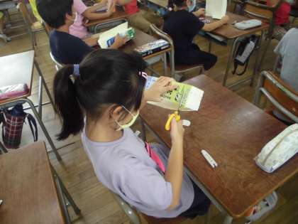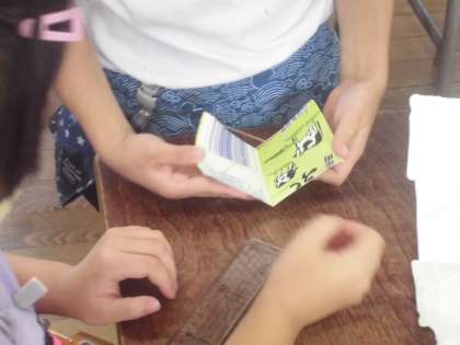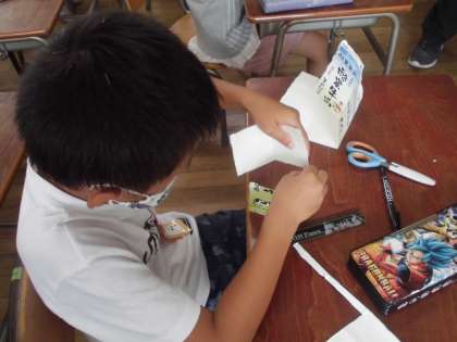 2年生は生活科で「パッチンガエル」を作りました。牛乳パックを切って長方形を作り、2つ折りにして輪ゴムをかけます。輪ゴムの反動でカエルのように勢いよく跳ね上がるおもちゃです。大変面白いおもちゃで、休み時間も「パッチンガエル」で遊んでいました。