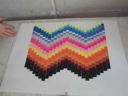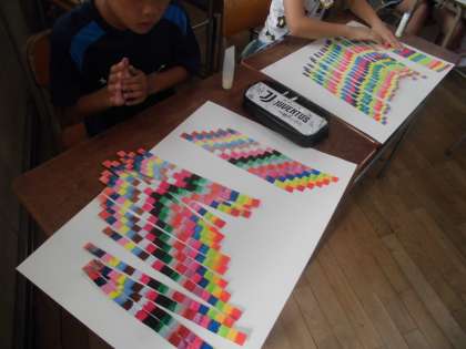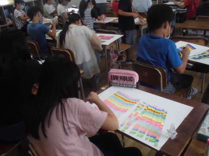 4年生は前の図工の時間に描いたグラデーションを切り、模様にしました。きれいな模様ができ、教室が明るくなりました。見事です!