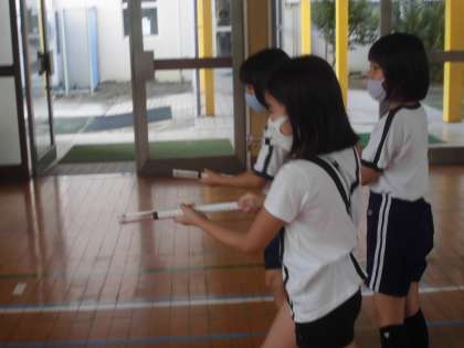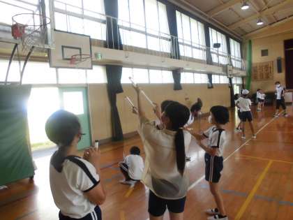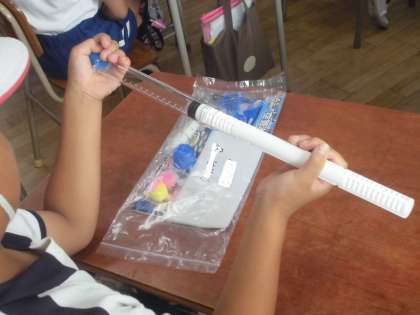 4年生は理科で空気鉄砲の学習を始めました。さっそく講堂で実験です。「ポン」「ポン」という心地よい音が響いて、子どもたちは楽しそうでした。