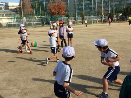2年生はドッジボールをしていました。半袖の体操服姿でも、へっちゃらな子がたくさんいます。