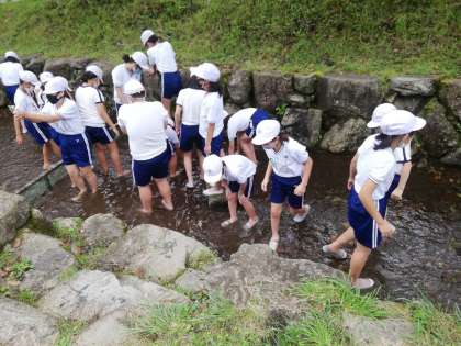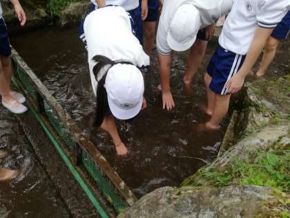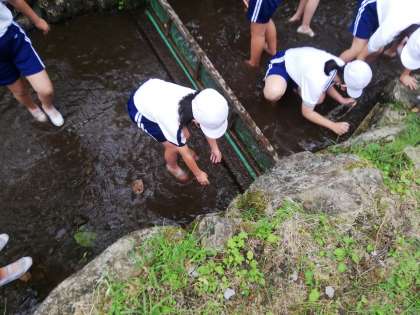 いよいよ魚をつかまえます。魚は素早く逃げ、子どもたちは悪戦苦闘です。