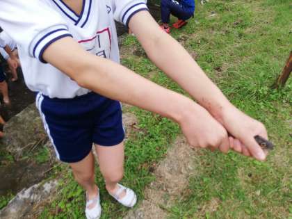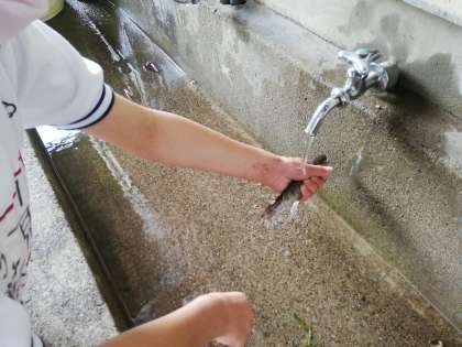 魚をとった子は大喜びです。魚を洗って焼く準備です。