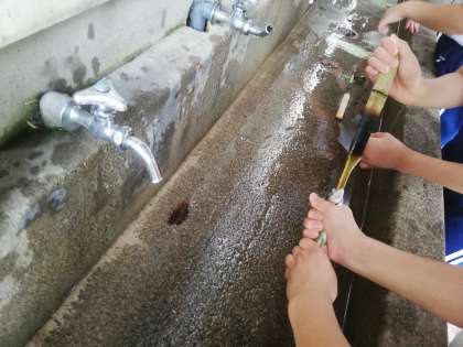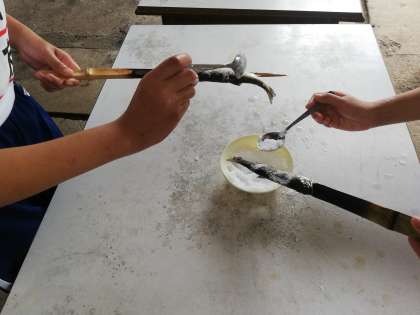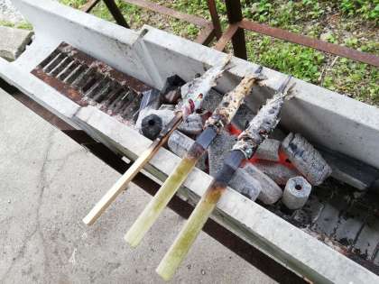 魚に串を刺して、塩をかけます。串を刺すことはむずかしく、助け合っていました。宿舎の方に焼いてもらいます。