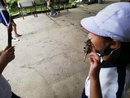 焼けた魚を食べます。みんなおいしそうに食べていました。楽しい魚つかみになりました。宿舎に戻り、お風呂に入っています。写真を撮れないので、しばらくアップは休止します。夕食は6時40分頃です。