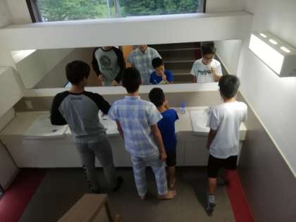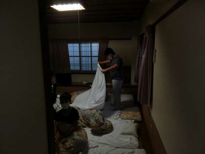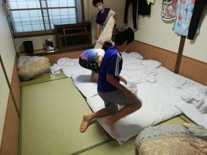 6時起床で、寝具の片付けや洗面に取りかかっています。昨夜はとても静かに休んでおり、みんな元気に2日目を迎えました。検温も全員がクリアです。夜の12時頃から降りだした雨が小止みになってきました。