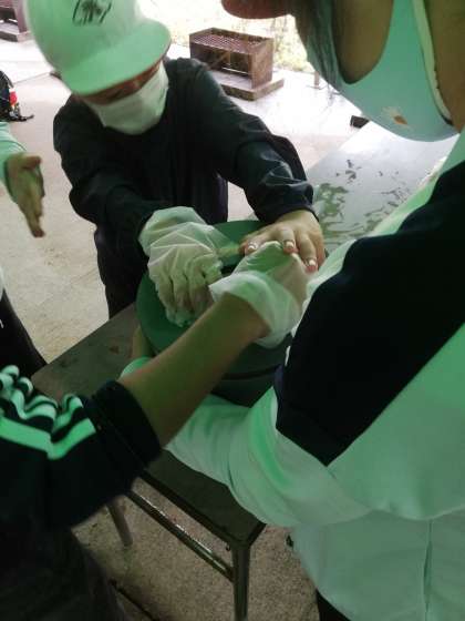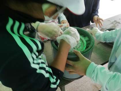 冷却用容器にアイスクリーム作り容器を入れ、塩をかけます。ふたをして最後の手順に進みます。