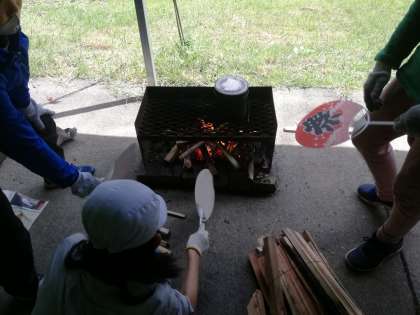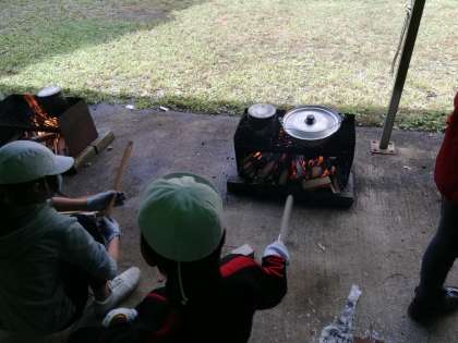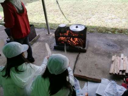 飯ごうとカレー鍋を火にかけます。あとは出来上がりを確認していきます。