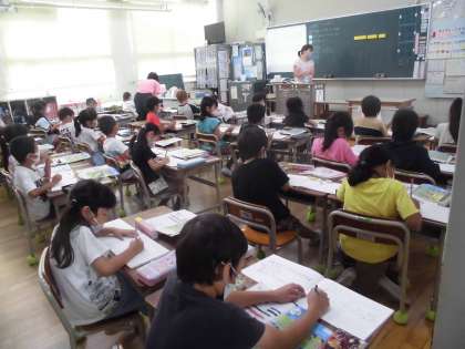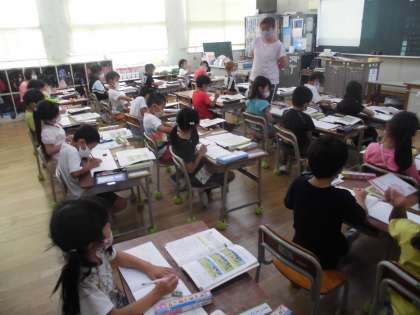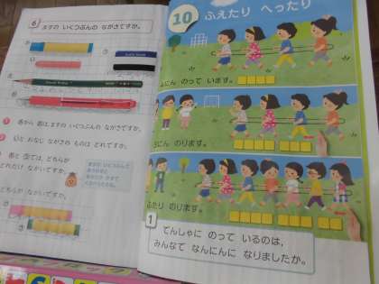 1年生は「ふえたりへったり」の学習をしました。バスに乗っていて最初の停留所で何人、次に何人というように乗客が増えていく場面を文章で読み、計算で答えを求める学習です。計算にも慣れてきて上手に計算をしていました。