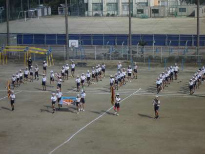 運動発表会に向けて各学年で一生懸命取り組んでいます。低・中・高学年部ともに児童の入場で開会します。例年のような1周はせず、後方から朝礼台に向かって直線で前進します。校旗や優勝旗も6年生の代表が持って先頭で入場します。緊張しながらも練習に力が入っていました。