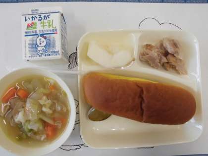 いよいよ今日から10月です。10月最初の給食は「豚肉の野菜スープ」「鶏肉のガーリック焼き」でデザートにリンゴがでました。デザートにリンゴが出るのは秋が深まっていることを感じます。