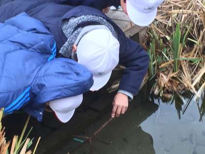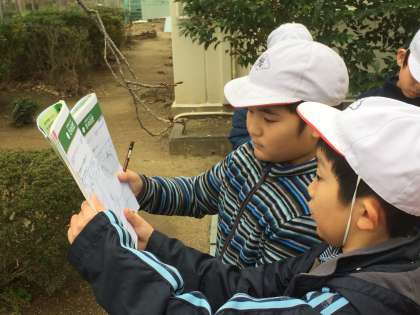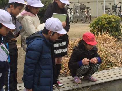 4年生は冬の自然観察をしていました。こんなに寒い校庭にも、春の息吹を見つけることはできます。