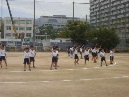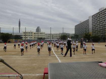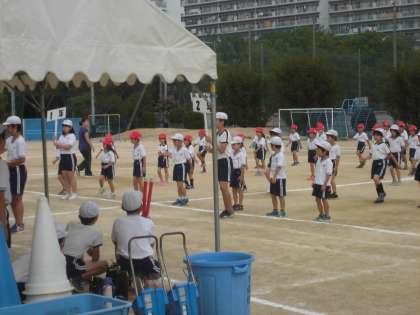 好天に恵まれ、運動場で1年生,2年生が練習です。入場行進等の開会には6年生も参加しました。6年生のアナウンスも上達してきました。