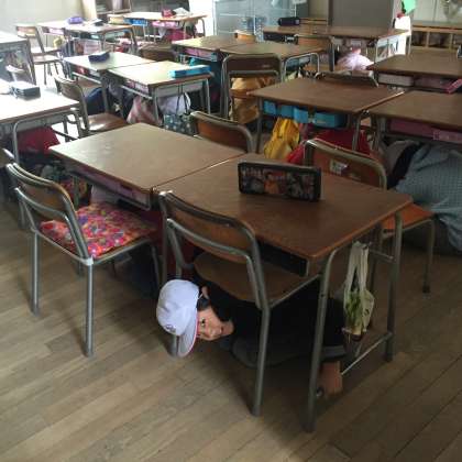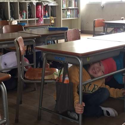 地震が発生した場合、まず自分の体を守ることです。先生がそばにいないこともありえます。自分で自分の身を守る行動を、すぐ行えるようになるまで、くりかえし訓練をしていきます。