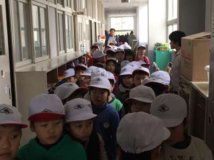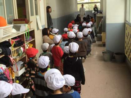 押しあったり、しゃべったりせずに、すばやく避難行動をとることも命を守ることにつながります。今日は運動場に避難して、人員確認をした後で、津波警報が発令されたという想定で、4階の廊下に避難する訓練をしました。