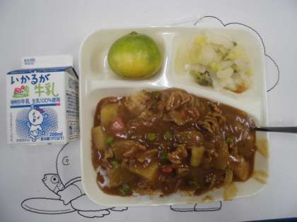 10月9日(金)の給食は「ポークカレーライス」「白菜のピクルス」とデザートはみかんです。カレーライスに子どもたちは大喜びです。みかんは冷凍ではなく、季節がどんどん進んでいることがわかります。