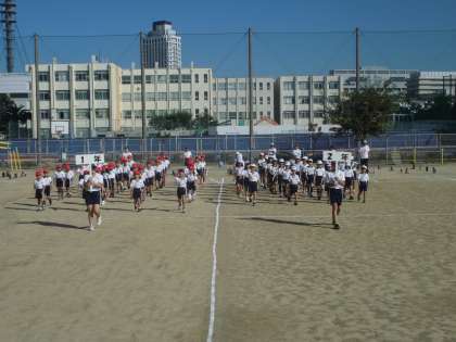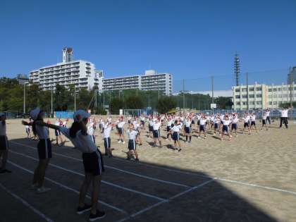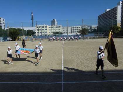 「運動発表会」の様子を紹介していきます。まずは「低学年の部」です。6年生の校旗、児童会旗の入場に続いて、1年生、2年生の入場です。整列後は元気よくラジオ体操です。1年生ははじめてラジオ体操を習いました。