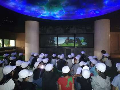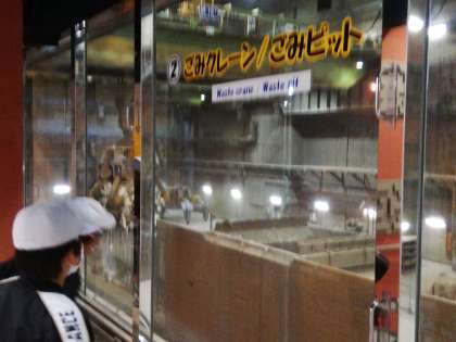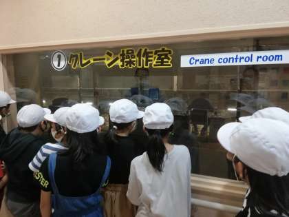 説明の、映像を見てからクレーン操作室の見学です。左奥にクレーンが見えます。