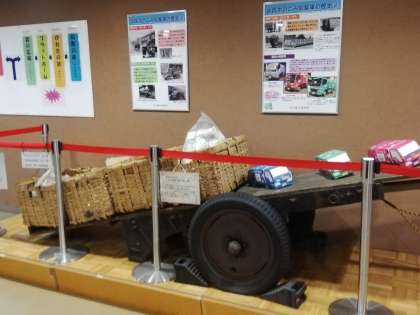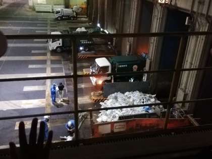 昔のごみ収集荷車の展示のあとは、パッカー車がごみを入れる様子を見ました。何台も車が行き来し、ごみの量の多さがよくわかります。