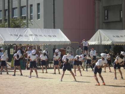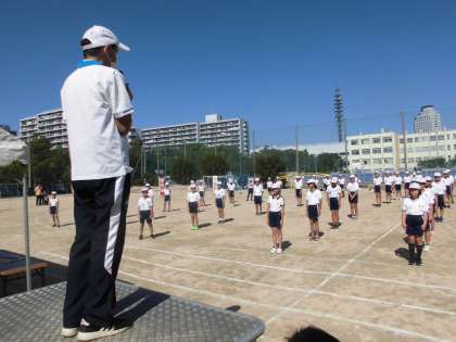 高学年らしく整然と並びます。ラジオ体操で体の準備をしました。