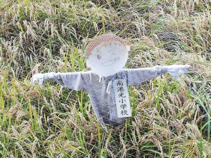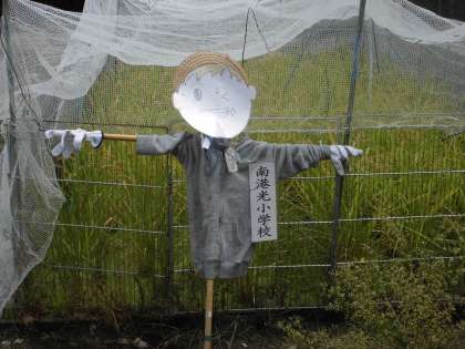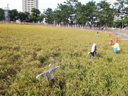 5年生が学習園で育ててきた稲を守ってくれていた案山子が、住吉大社の御田(おんだ)に移り、御田を守ってくれました。もともとは5年生の稲は住吉大社からいただいた苗です。御田の稲刈りは14日に行われましたが、例年、刈り取りをした御田でしばらく飾っています。(御田の場所は住吉大社の南側の道路沿いです)この場所になければ住吉大社の境内に飾っているかもしれません。