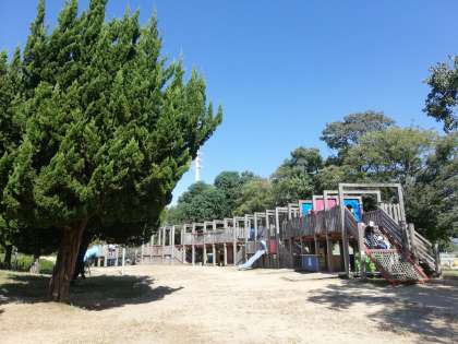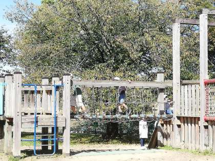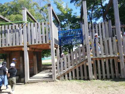 木造の遊具も人気です。抜けるような青空で絶好の遠足日和です。