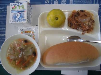 10月20日の給食は「なすのミートグラタン」「鶏肉と野菜のスープ」とみかんでした。ミートグラタンは子どもたちの人気のメニューです。