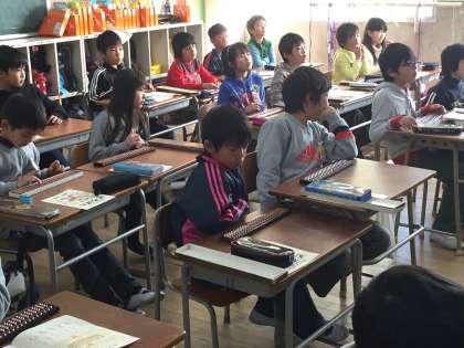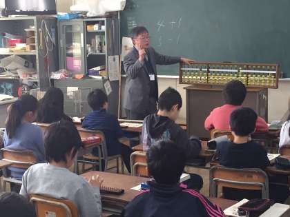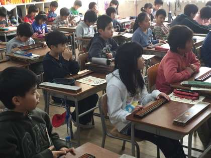 3年生は昨日から珠算教室を行っています。講師に、咲洲高校の竹内先生に来ていただいています。そろばんを触るのもはじめてという子がほとんどですが、教えていただきながら、珠をはじいていました。