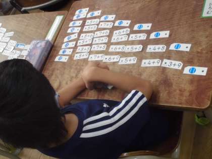 1年生は足し算のカードを並べて足し算の法則を見つける学習をしました。カードを裏返しながら少しずつ考えを深めて、正解を導いていました。