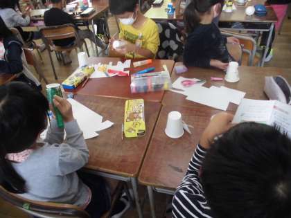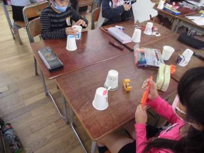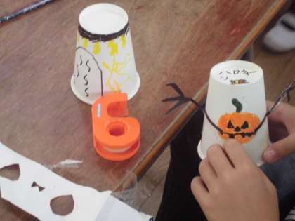 2年生は生活科でおもちゃ作りに取り組んでいます。これまでも楽しいおもちゃを作ってきました。今日は紙コップを使って、輪ゴムで飛ぶおもちゃを作りました。この時期らしく「ハロウィン」のデザインがいくつかみられました。