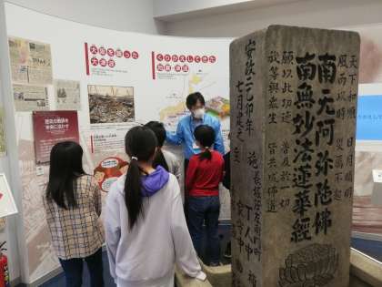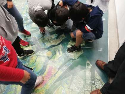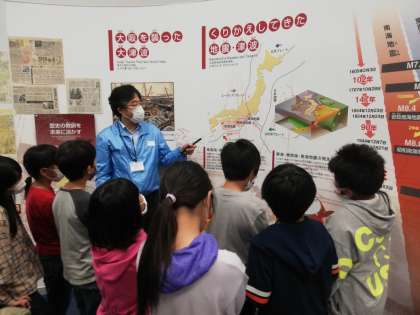 地震と津波についての学習です。地震が繰り返し起きていることや自分たちの将来に大きな地震が起きる可能性が高いことを知りました。床に描かれた大阪市の地図を見ながら、南港の津波の予想について考えました。