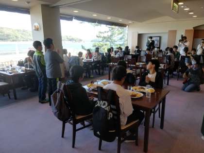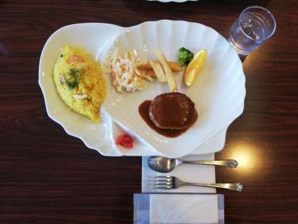 昼食です。海鮮ビラフ、ハンバーグ、マカロニサラダ、ブロッコリー、フライドポテト、オレンジで福神漬けです。おいしくてみんな満足です。
