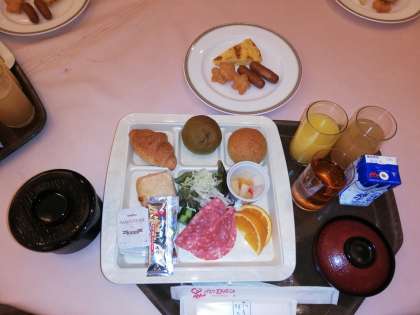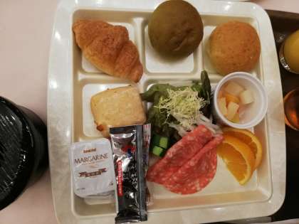 いよいよ朝食です。種類の違うパンが4つなど、夕食と同様に盛りだくさんのメニューです。