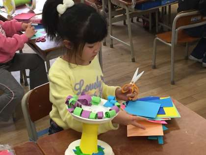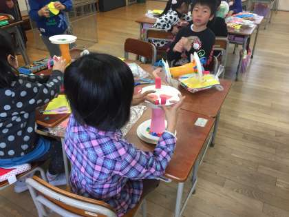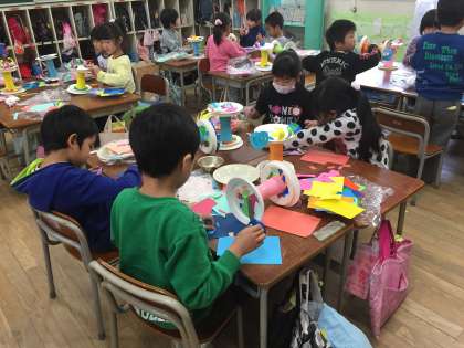 1年1組は、みんなで作品づくりをしていました。やっぱり、友だちと一緒がいいね。