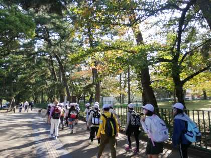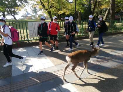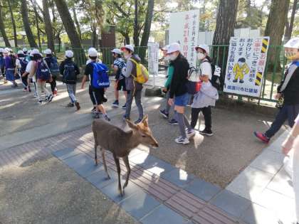 5年生は秋の遠足で奈良公園に行きました。さっそく鹿さんのお出迎えです。