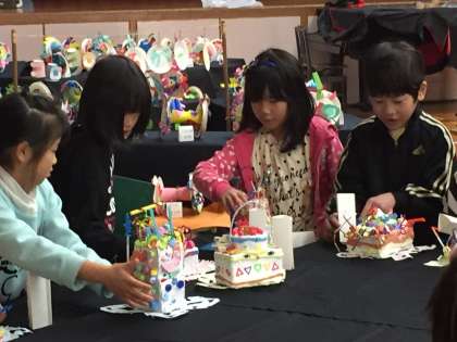 いろいろな飾り付けがついたケーキは、どれもとてもきれいです。テーブルに並べるとお菓子の甘いかおりがしそうです。