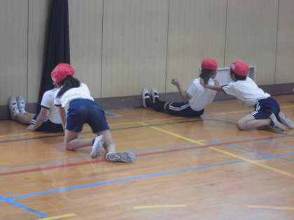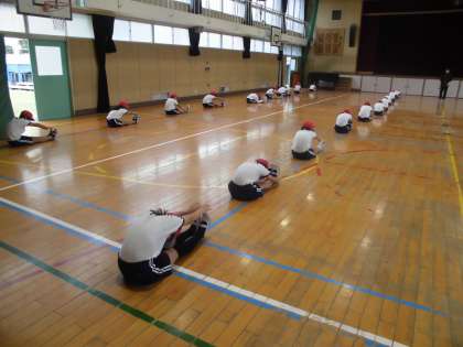 3年生は体を柔らかくするため柔軟体操に取り組みました。「痛い」と言って歯を食いしばる児童もおれば、上半身がぴったり足につく児童もいました。少しずつ取り組んでいけばみんな上達していくことでしょう。