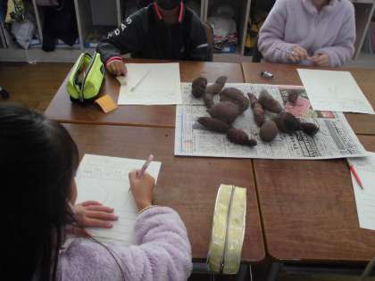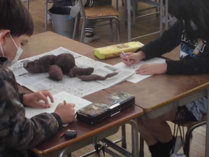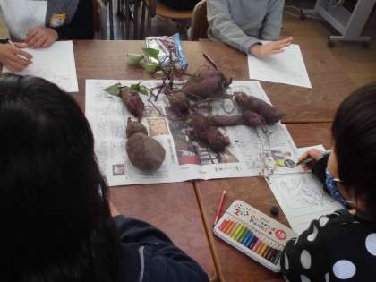 2年生は芋ほりで掘ったさつまいもの絵を描きました。つるや土がそのままの状態なので、さつまいもの自然な姿を観察できました。