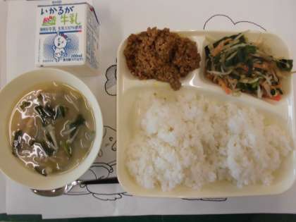 11月17日の給食は「ドライカレービビンバ」「トック」で、韓国・朝鮮の料理です。この献立は昨年度の「学校給食献立コンクール 優秀賞作品」で、新生野中学校の昨年の1年生が考えました。この生徒の言葉です。「献立のねらいは、栄養を考えて野菜をたくさん使い、見た目でも食欲がわくようにしました。また、ほかの国の食について考えるきっかけになればと思い考えました」です。その言葉通り、色どりがよく、とてもおいしくいただきました。なお、写真のドライカレーとビビンバはご飯にかけて食べます。